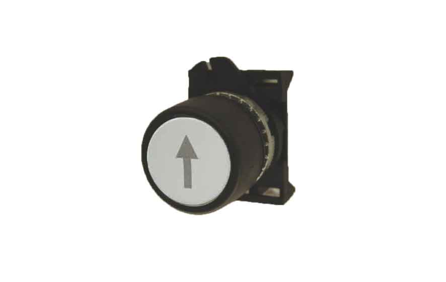 Ploche tlačítko, bílá barva, s popisem "šipka nahoru",prům. hlavy 30mm, díry 22mm, IP