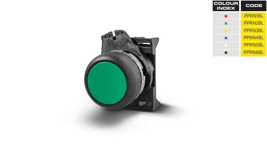 Ploche tlačítko, zelená barva,s popisem "I", průměr hlavy 30mm,průměr díry 22mm, IP65