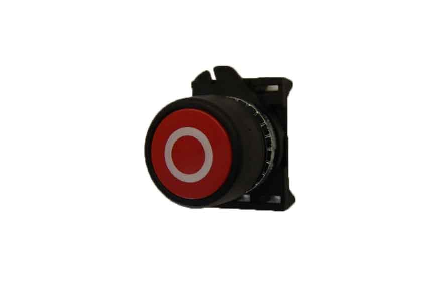 Ploche tlačítko, červená barva,s popisem "O", průměr hlavy 30mm,průměr díry 22mm, IP65